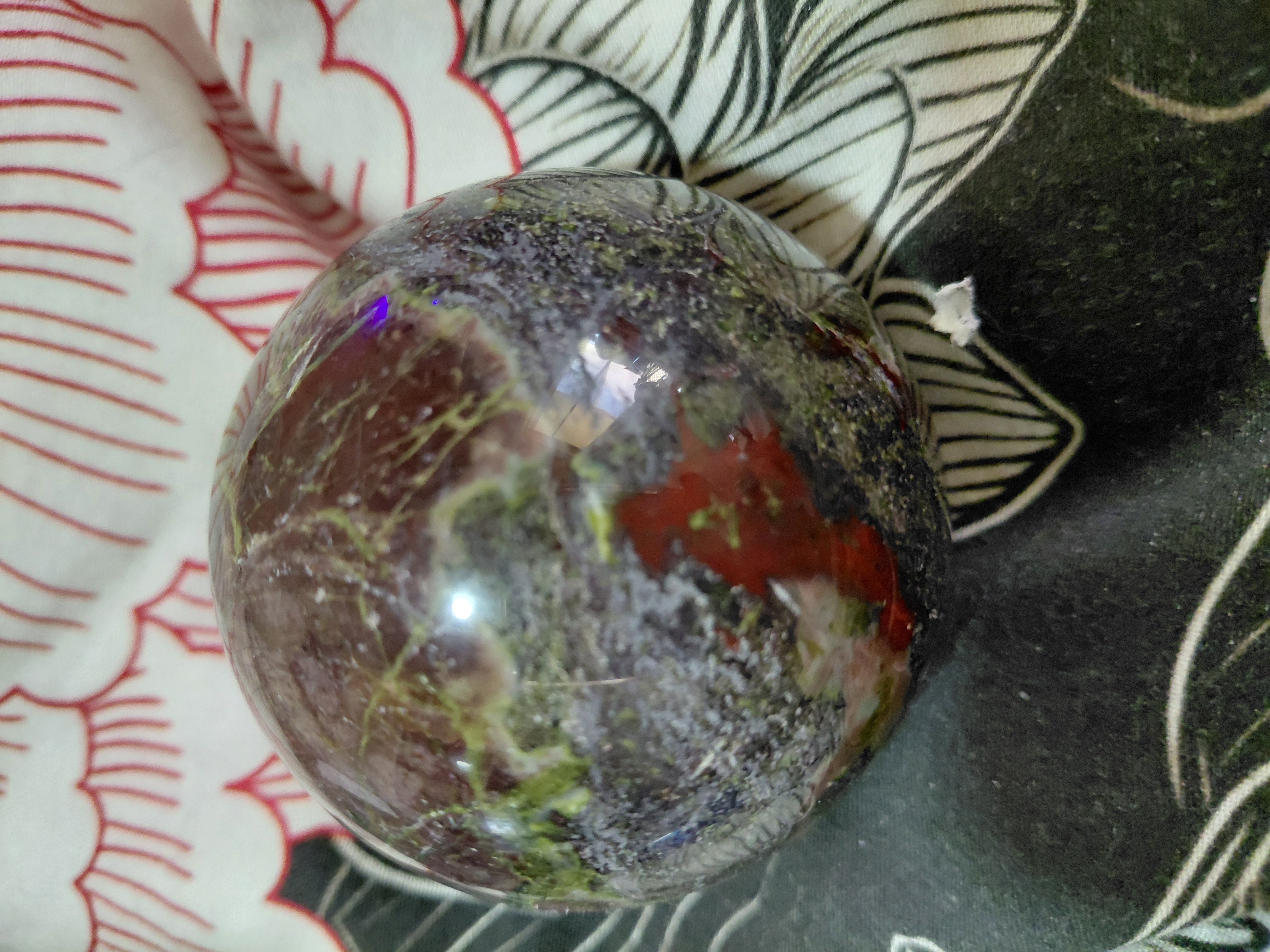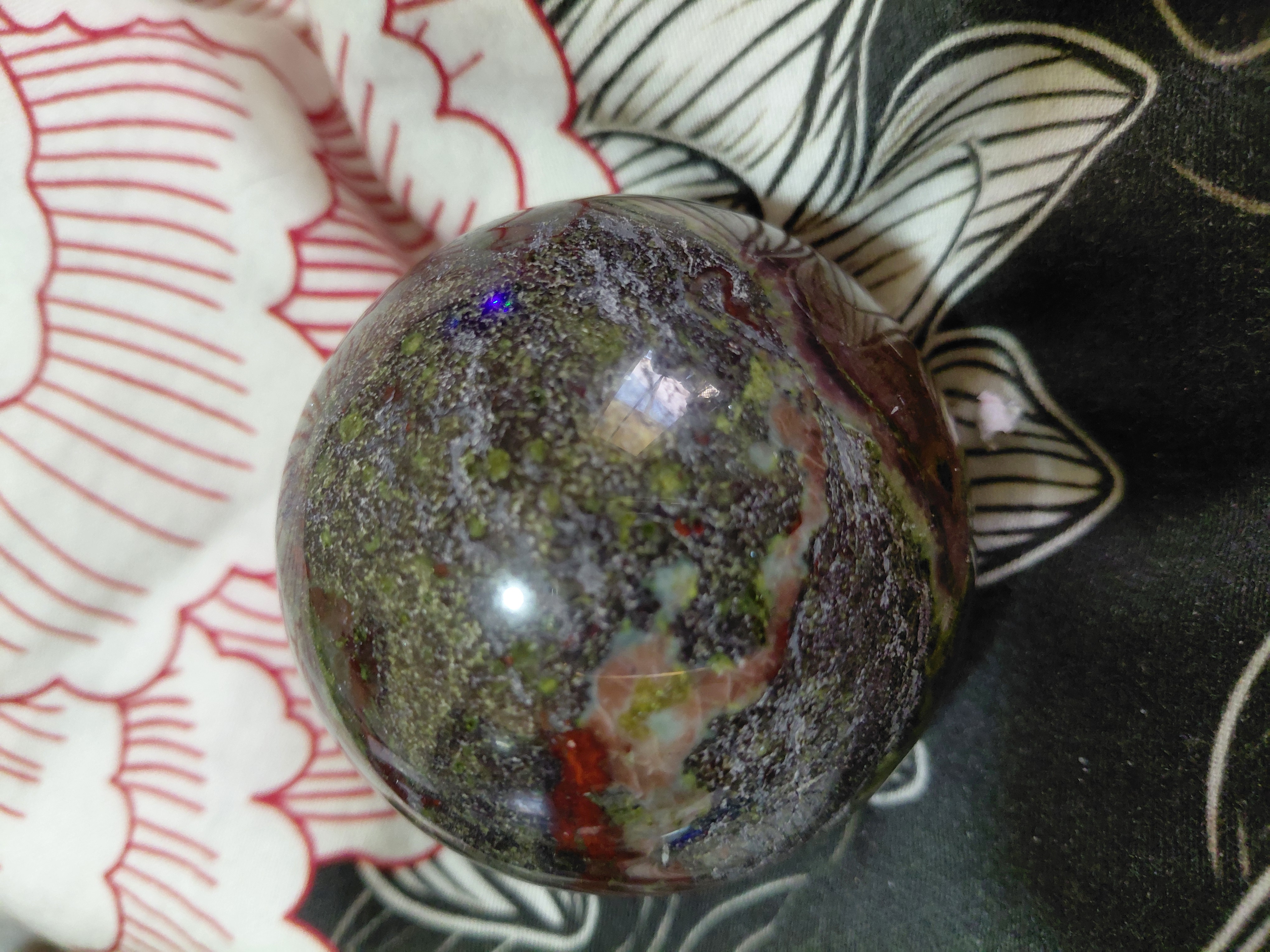 Introducing the enchanting Dragonsblood sphere, a stunning addition to your collection of Crystal Spheres that not only captivates the eye but also resonates with powerful energies. This unique sphere is crafted from the rare and mystical Dragonsblood stone, known for its deep red and green hues that swirl together in a mesmerizing dance. Each sphere is a one-of-a-kind masterpiece, showcasing the natural beauty and intricate patterns that make it truly special.