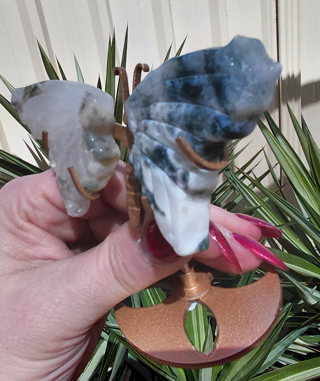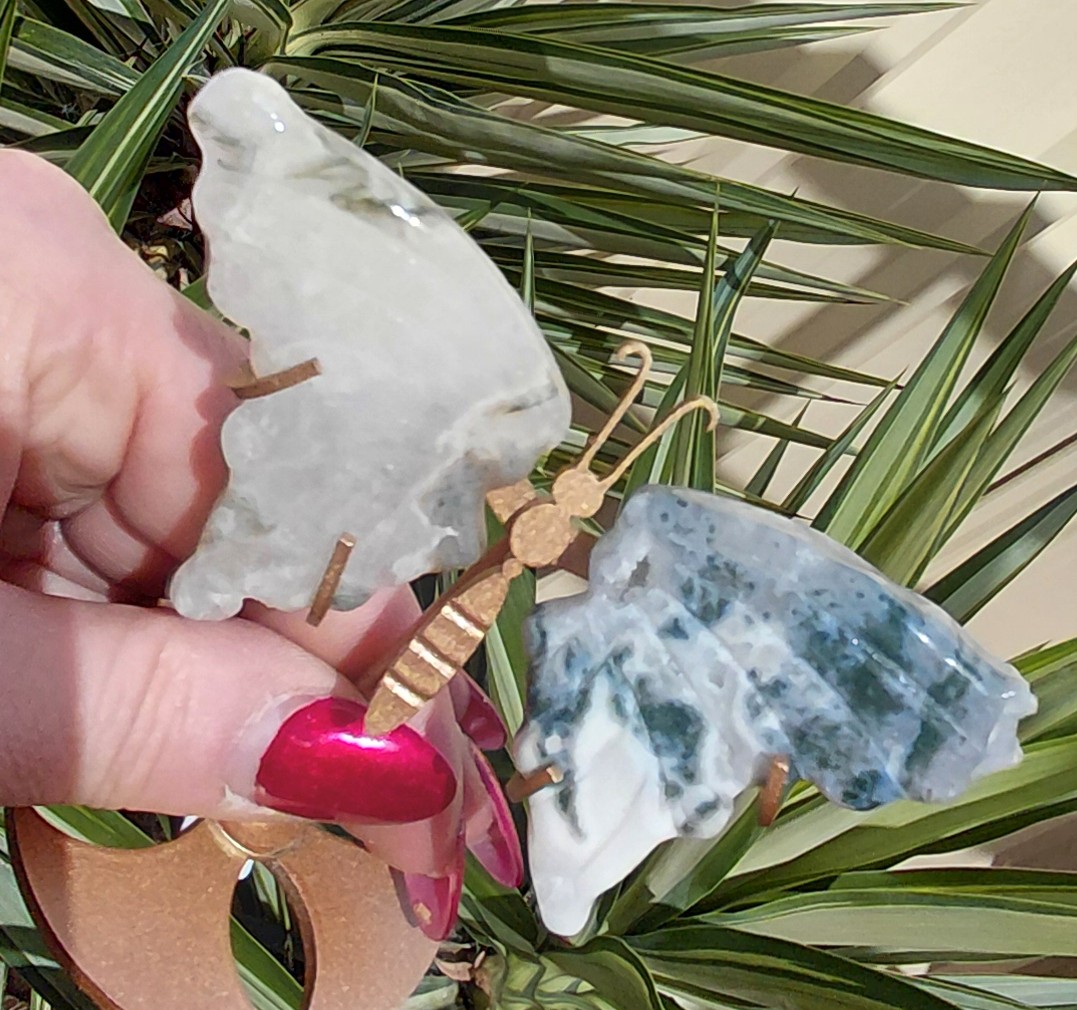 Not only do these butterfly wings serve as a stunning decorative element, but they also carry the metaphysical properties associated with moss agate. Known as a stone of new beginnings, moss agate is believed to promote growth, abundance, and positive energy. It’s perfect for those looking to enhance their environment with a touch of nature’s beauty and a sprinkle of good vibes.