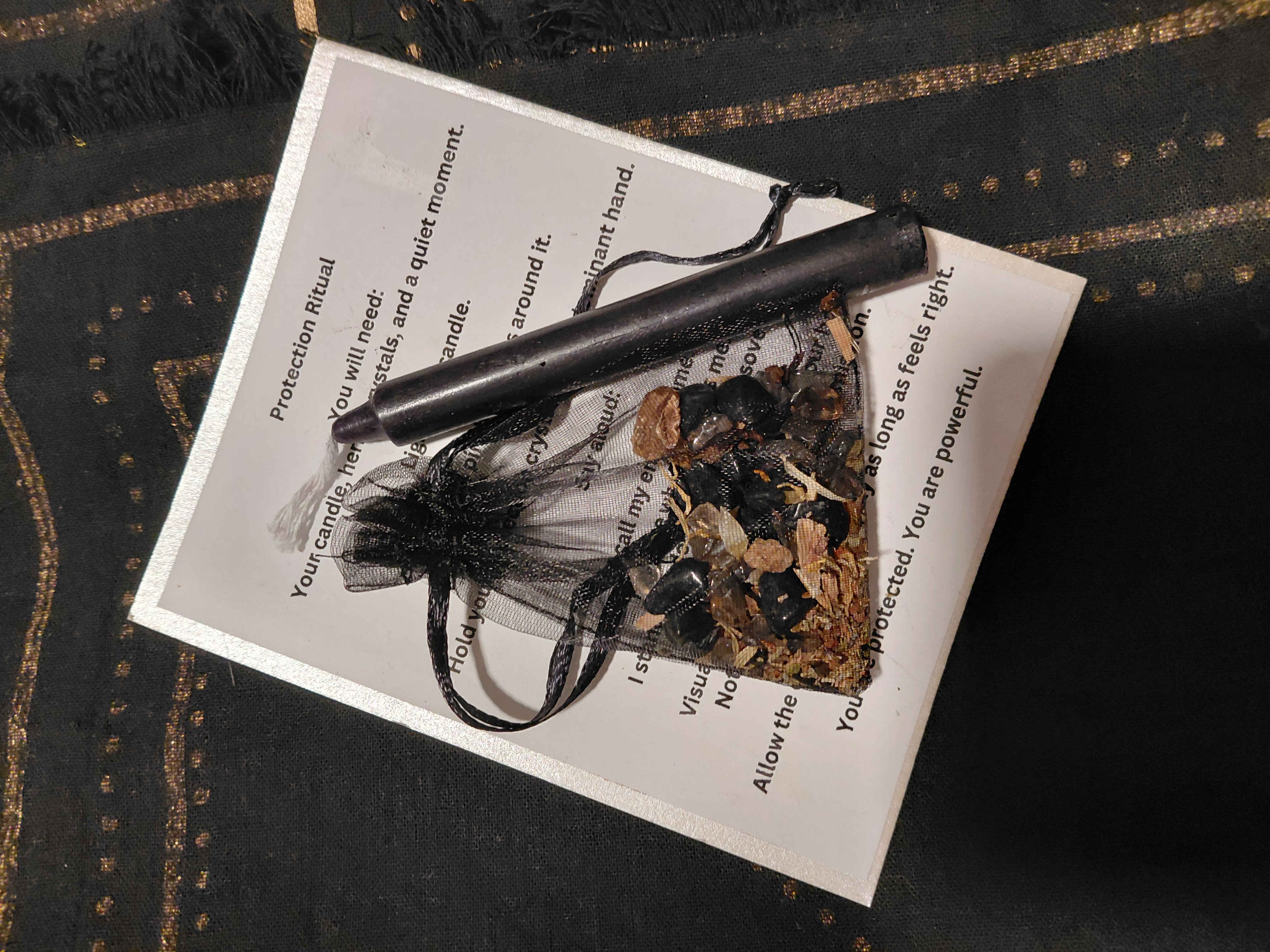 Light the black candle with intention, sprinkle the protection herbs as directed, and hold or carry your crystal pouch to anchor the energy. The ritual focuses on setting clear boundaries, removing negativity, and calling in spiritual protection.