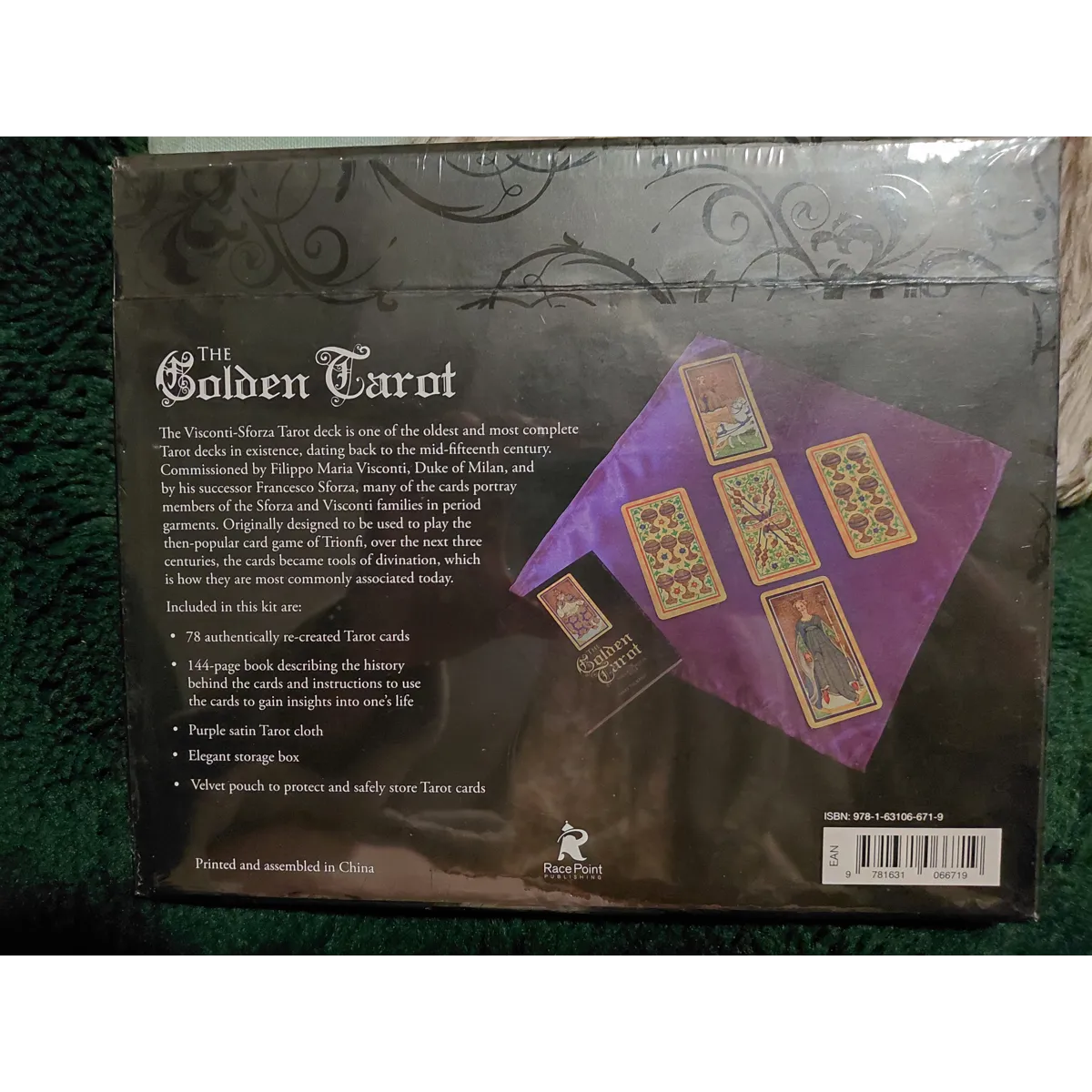 The Tarot is much more than mere pictures on cards, the pictures are physical symbols for spiritual concepts. The images are symbolic representation of archetypal forces and/or beings which have always existed and have been identified and passed on to us by ancient initiates and which provide a focus for us to use in self-initiation, spiritual development, and the perception of hidden wisdom. The tarot deck included in this beautiful set was commissioned around 1451 by the Visconti and Sforza families, and it is one of the oldest tarot decks in existence. The images on the cards have been faithfully recreated, showing members of the Sforza and Visconti families in period garments. The borders of the elegant cards are adorned with gold metallic ink. The accompanying book provides a history of Visconti-Sforza cards, 35 of which are now in the collection of the Pierpont Morgan Library in New York City. The symbolism of the different cards is described, along with explanations of different ways to arrange the cards when seeking information about different aspects of life. This beautiful gift box holds the book and card deck side by side, with a purple satin reading cloth folded and placed underneath the book.